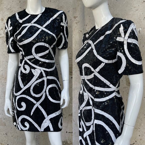 Vintage 80’s/90’s Sequined Dress by Lawrence Kazar, Black & White Swirls, M.