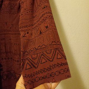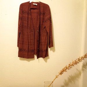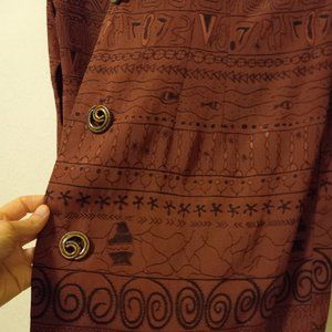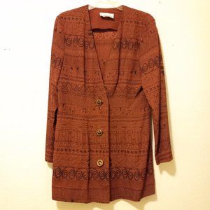 Vintage blazer dress. Rust colored with rows of varying black geometric, slightly tribal, and abstract motifs. Vaguely tribal or hieroglyphic. Swirl/coil shaped buttons- functional, so it can be worn open as a lightweight longline blazer/coat too. Light shoulder pads. VGUC. There are safety pins behind each button, but they don't seem to be necessary to hold the buttons- just extra. VGVC.