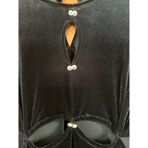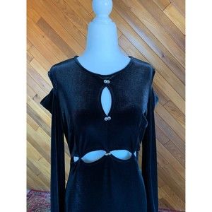 This gorgeous black velvet dress has cut outs along the chest and torso. It also has cutouts to expose your shoulders.