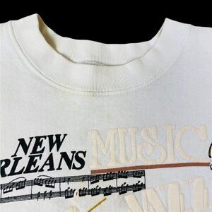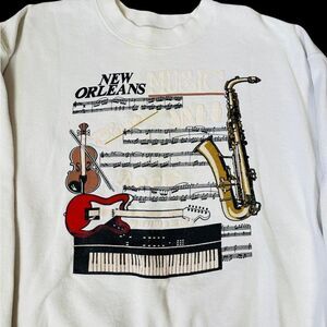 Vintage 80s BVD White New Orleans Sweatshirt XL Thrashed Music Jazz Instruments Dadcore Dad Pullover Violin Fiddle Sax Saxophone Electric Guitar Keyboard Piano Notes Sheet Rock Rhythm Blues Classical Souvenir Nola Streetwear