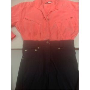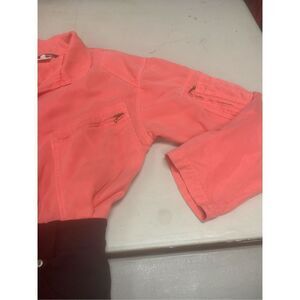Ladies super cute coral colored cotton Bomber style asymmetrical zip 80's jumpsuit with stirrup bottom pants. Has some paint stains as shown in the pic. Way too cute not to be worn. Otherwise in good condition. Great collectors item.