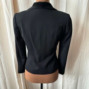 - Fabric Tag is missing but Real Authentication identified this as a silk blend blazer. It is probably wool & silk blend with silk lining & velvet trim