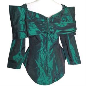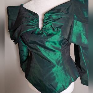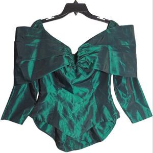 Vintage 80s Emerald Green Iridescent Off Shoulder Bow Sleeve Formal Top Blouse 8