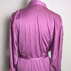 Experience the elegance of Miss Elaine's medium shade purple chemise nightgown and matching robe, featuring delicate sheer lace detailing and a silky flowing silhouette for ultimate comfort and sexiness. Robe has inside ties, pockets and a tie waist belt. Made in USA