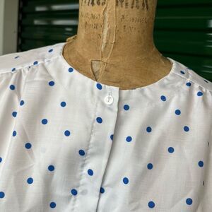 Vintage 80s Pykettes White & Blue Polka Dot Short Sleeve Blouse XL USA