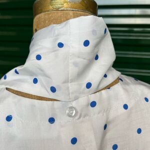 This lightweight, button-down blouse features a crisp white background adorned with vibrant blue polka dots. Its classic short-sleeve silhouette, slight gathering at the shoulders and high neckline. The detachable neck scarf adds a touch of retro versatility—wear it tied in a bow for a polished look or left open for a relaxed, casual vibe.