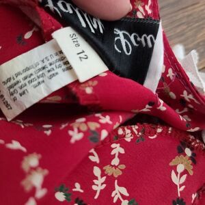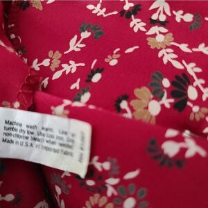 Red Dainty floral printed deep v-neck dress with shoulder pads giving it a power dressing structure. Fitted waist and skirt give it a classicly chic look. back zipper closure and pockets