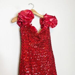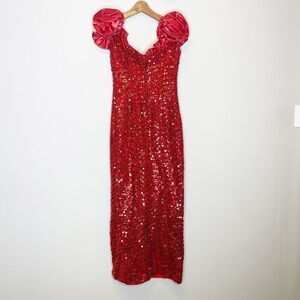 Vintage 80s Red Sequin Dress XS Formal Pencil High Slit Flashy Va Va Voom Sexy