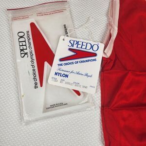 This vintage Speedo singlet is crafted from lightweight nylon, offering durability and comfort. Its vibrant red hue with white trim creates a striking contrast.