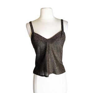 Vintage 80s XS/S Lurex Knit Tank Top Black Gold Strappy Crop Semi-Sheer Light
