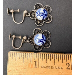 Vintage 835 Silver Delft Windmill Porcelain Dangle Screwback Earrings Signed