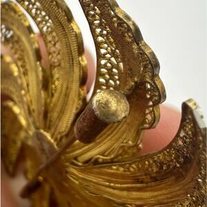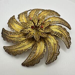 Excellent vintage condition, shows only hints of wear. This lovely piece is certainly European, constructed entirely of tested guaranteed 900 silver, gilt in gold with all filigree elements being done entirely by hand and arranged in a lovely pinwheel. Center is finished with five genuine red coral embellishments, these show natural inclusions and pitting but are not flawed. There is a small marking on the trombone catch mechanism but it is almost entirely obscured. Weight is 10.89 grams. Clasp functions perfectly. Please see photos for measurements in inches.