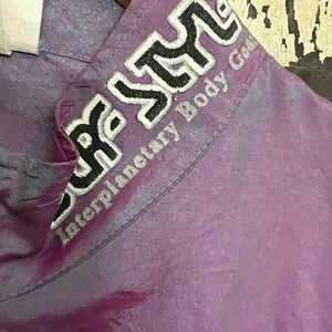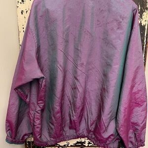 Vintage. Washed and fresh. No holes there are some spots but due to metallic/iridescence you can’t see them unless you press down on garment. See last three pics*****Priced accordingly. Cool a hell nylon jacket. Made in the USA. Nylon poly blend. Unisex. From smoke free home.