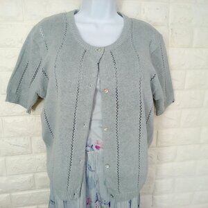 and, Cardigan short sleeve Sweater linen/cotton Knit, shell buttons front in Baby Blue, women's- Medium (M ).