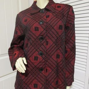 Vintage 90s 80s Sarah Bentley womens long sleeve blazer top button up shirt with collar in red and black glittery sparkly argyle/diamond geometric pattern tapestry. Has big black buttons accents. Has 4-inch slits at the sides bottom. Excellent condition, preowned. Material is 85% Polyester 15% Rayon. Womens tops great as suit top/blouse or blazer, women's outerwear, windbreaker jacket, etc. Flexible style: grannycore, grandmacore, cottagecore, business casual, office/career/work wear, travel, party outerwear, etc. Hurry! We only have ONE PIECE of this item!