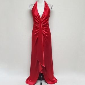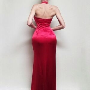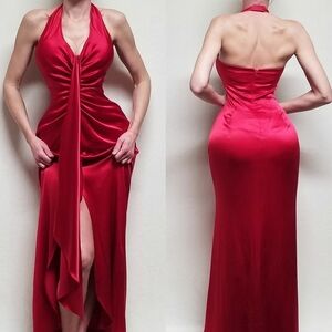 Vintage 90s ABS Evening Red Charmeuse Satin Halter Plunging Neckline Maxi Dress.