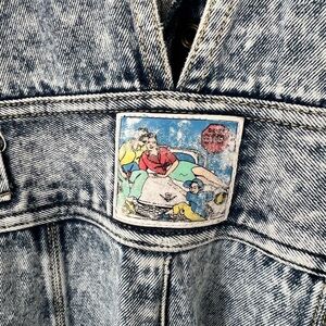 Vintage acid wash straight leg silhouette with front pockets and front button detail. V neck with seamed detailing. Cartoon patch in back and feels like faux leather.