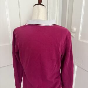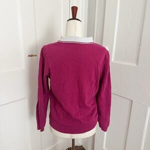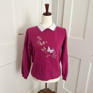 Women’s vintage 90’s crewneck collared sweatshirt from Adrian Delafield. Magenta pink with a white collar and embroidered butterflies. Crewneck and long sleeve. In excellent vintage condition.