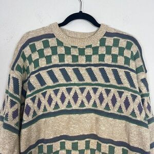 Vintage 90s Alan Flusser Cream Striped Crewneck Cotton Sweater Men's Size Large.