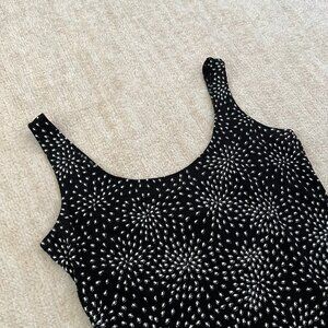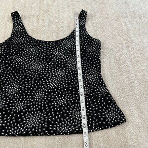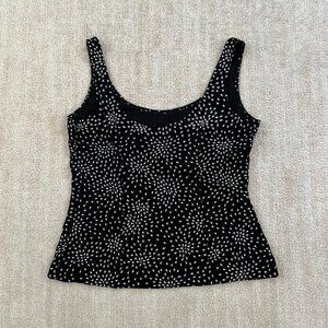 A black silver and white knit sleeveless blouse top. Fabric has stretch