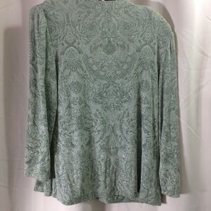 A beautiful vintage-style Alex Evenings jacket in a soft light green with all-over glitter and an ornate pattern. Perfect for weddings, holiday events, cruises, and special occasions. Light shoulder pads give it structure, and it has one simple hook-and-eye closure at the front. Lined and comfortable with stretch.