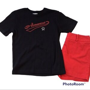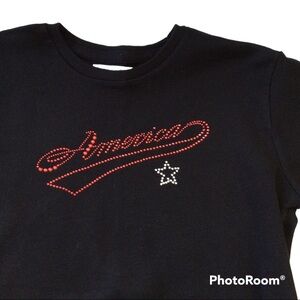Vintage 90s classic embellished black knit short sleeve crew neck cotton top with America and a star in red and silver bling. Perfect on its own and cute under a jacket