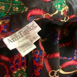 Vintage 90’s Ann Taylor Studio 100% Silk Button Up Blouse. Long Sleeve Black with tassel print. Bold colors, size 6.