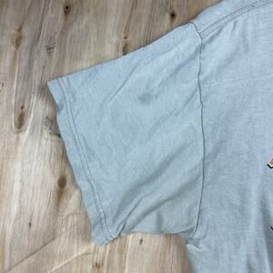 Shows heavy wear with multiple holes near the back graphic, small stains/marks throughout, and some collar fraying. True vintage distressed look. Please see photos for details.