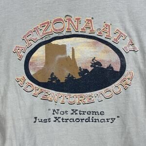Vintage Arizona ATV Adventure Tours t-shirt. Features a large desert landscape and ATV rider graphic on the back with the text “Not Xtreme, Just Xtraordinary.” Front chest has a small ATV rider print with contact info.