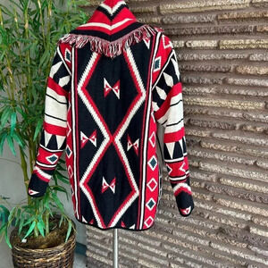 Vintage 90s Aztec Red and Black Reversible Tapestry Fringe Blanket Jacket