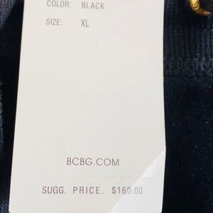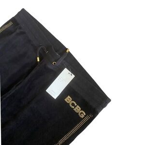 Rich brushed black Track bottoms with the signature GOLD EMBELLISHMENTS OF BGBG enhanced with 4 rows down the legs. Approximate measurements are Waist 36” Length 33” 2” Drawstring Waist Authentic BCBGMAXAZRIA with tags attached. Retail at 160.00