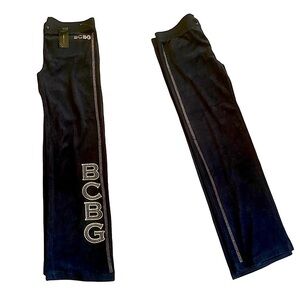 Rich brushed black Track bottoms with the signature GOLD EMBELLISHMENTS OF BGBG enhanced with 4 rows down the legs. Approximate measurements are Waist 36” Length 33” 2” Drawstring Waist Authentic BCBGMAXAZRIA with tags attached. Retail at 160.00