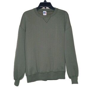 The product is a vintage 90s Russell Athletic crewneck sweatshirt in green, size Extra Large, made in the USA. It features a solid pattern, long sleeves, a pullover closure, and a crew neckline. The sweatshirt is a regular fit and is machine washable. Additionally, it is accented with embroidered logos, reflecting its 80s and 90s theme, making it a versatile piece for various activities such as gym training, walking, and casual wear.