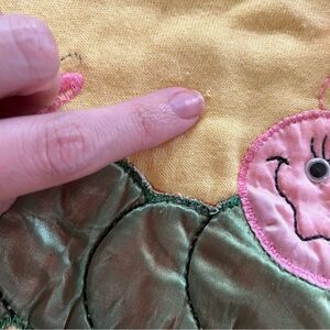 This is a sweet little sweatshirt from the brand Bull Frog with a kooky ice skating caterpillar. Complete with embroidered skates, satin quilted caterpillar segments, sewn on googly eyes and lil pom poms.