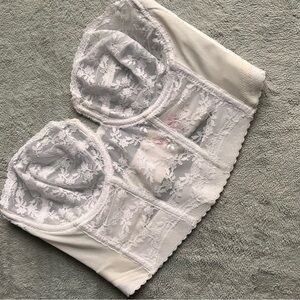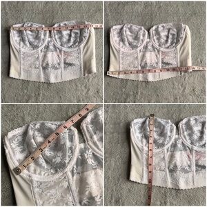 Great vintage condition. Longline Corset Lace Bra Top from Backless by Young Smoothie, The Strouse Adler Co., in white. True vintage, circa late 80s/early 90s. Vintage girly aesthetic. Super on trend, great to wear as lingerie or to dress up for an everyday outfit. Strapless bustier bra top with underwire cups and structured boning. Stretch sides and back band with hook closure. Delicate semi-sheer floral lace insets, see video. Note: light wear throughout with minor fabric wear and yellowing at band, see photos. Size 38C, see photos for measurements.