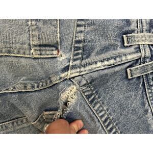 *please see in the photos that there are holes in the back pockets, repairs on the front and staining throughout