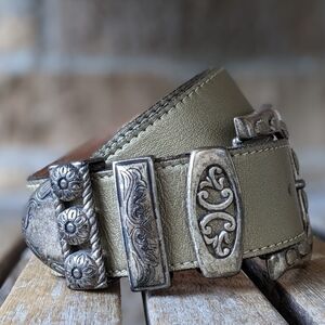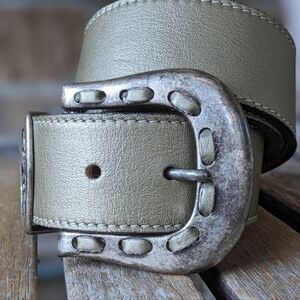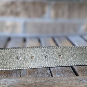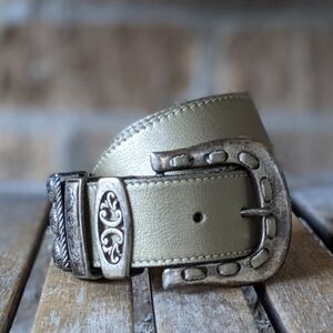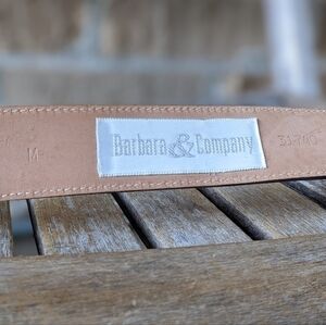 Excellent preowned condition muted light gold leather western belt from Barbara & Company. Woven detail belt buckle. 90s true vintage.