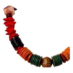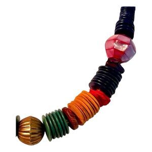 Vintage 90s Beaded Necklace Rainbow Wood Stone Beads Chunky Copper Tone Metal