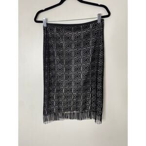 Vintage 90s Bebe Black Lace Fringe Knee Length Stretchy Elastic Waist Skirt