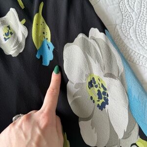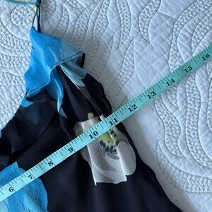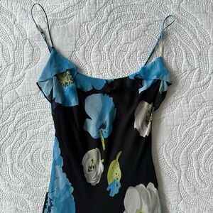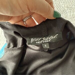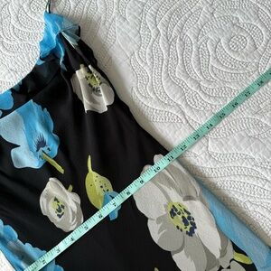 Beautiful vintage 90s Betsey Johnson black and blue floral print maxi dress. Such simple and elegant lines finished with a ruffle bust line and ruffled high low hemline. Perfect summer dress or quite simply year round for any event. Fully lined