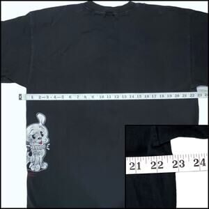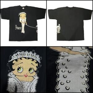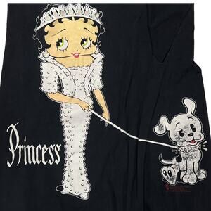 Men's vintage 90's Betty Boop Princess Diana double sided t-shirt. Betty is wearing a tiara & white gown that stands out nicely against the black shirt. Gown has small glitter dots all over Princess is printed beside her. Betty's dog Pudgy can be seen on the back. 100% Cotton. Due to light & screen variations, colors may vary slightly from the images
