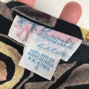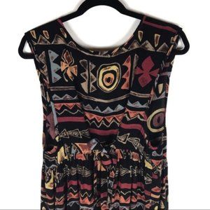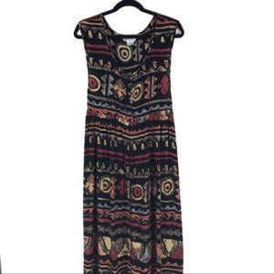 Vintage 90’s black aztec tribal print sleeveless babydoll maxi dress. Buttons down the front & ties at the back.