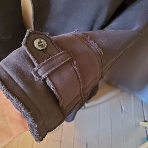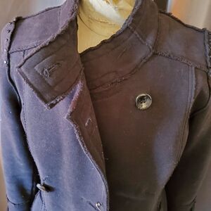 This is a fun fabulous coat! Apparently an old label that Express put out, it is soft plush, like a cotton jersey fabric, medium weight. with Lining. Small/Medium - 36" long, 17" across chest, and 15" across shoulders and waist. It has some cool embellishments, sequins and stitching. A few buttons are missing, but one extra is included,, plus a few extra that are only decorative so they could be rearranged for use in the button holes. It has loops for a belt, which is missing, though any belt will work, or you can simply remove the loops, as the coat is cinched in the middle.
