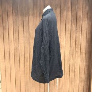 Vintage 1990s Lynn French Black oversized, crepe, button front shirt with bronze metal buttons and diamond spiral ornaments on the front placket, lapels, and cuffs. Soft cotton crepe material is extra comfy. Made in USA. Condition is excellent vintage with one tiny pull.