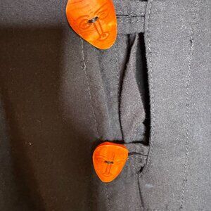 This vintage 90s black and orange boho kaftan features maxi length and fringe accents, perfect for art-to-wear enthusiasts seeking a unique piece. Embrace the timeless style with this versatile garment. Excellent pre-owned condition. The top button has come off, but is attached with a safety pin.