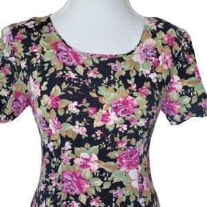 Vintage 90s Black Pink Floral Casual Dress Roses Size 6 8 Rayon Knee Length.