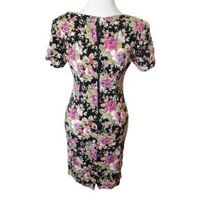 Vintage 90s Black Pink Floral Casual Dress Roses Size 6 8 Rayon Knee Length
