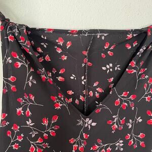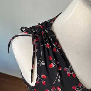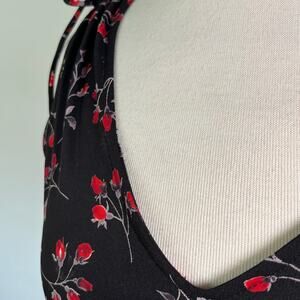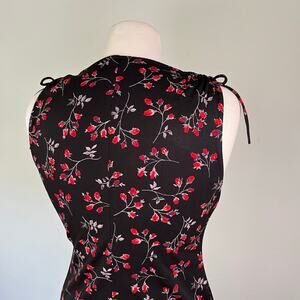 Vintage 90s Black Red Floral Rose Mini Dress Ruched Tie Shoulders V Neck Whimsigoth Witchy // Size Medium