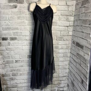 Vintage 90s Black Satin Asymmetric Sheer Ruffle Hem Maxi Slip Dress