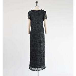 Vintage 1990's black and silver crochet lace dress. Sheer with stretchy knit lining. Sheer sleeves. Scoop neckline. Maxi length. + belt is not included